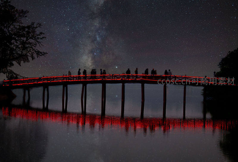 星空下的红色木桥倒影如画