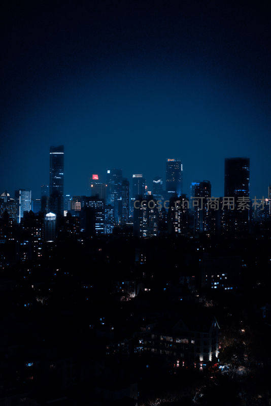 夜色深沉,城市轮廓在幽蓝天空下若隐若现,点点灯火如星辰散落楼宇之间,营造出一种神秘而静谧的氛围,令人沉思遐想。