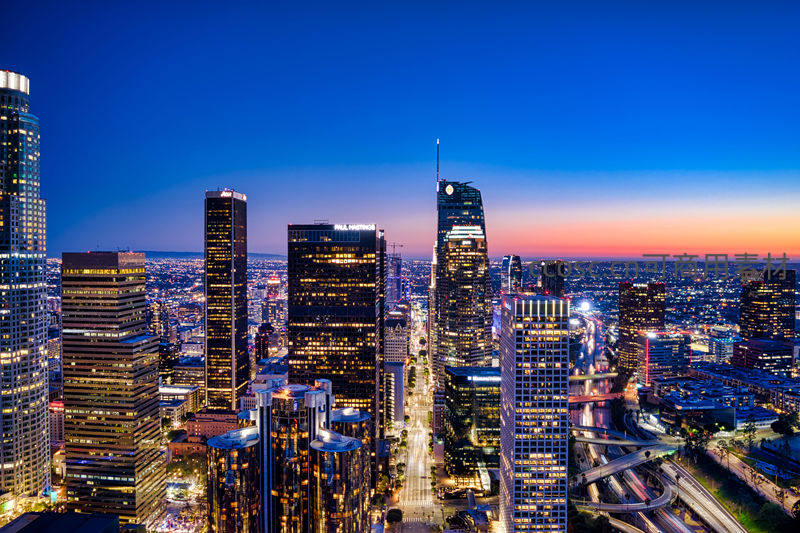 夕阳西下,洛杉矶市中心的摩天大楼群被染上温暖的金光,街道车流如织,霓虹初现,展现这座不夜城从白昼向黑夜过渡的迷人瞬间。