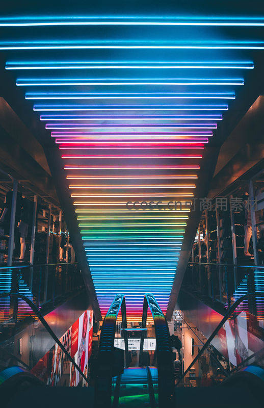 商场中庭的自动扶梯被层层叠叠的彩虹色霓虹灯带包围,形成炫目的视觉隧道,充满未来感和艺术气息,吸引顾客驻足拍照。
