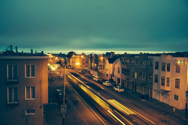 黄昏时分的城市街道上,车辆行驶留下的金色光轨穿梭于两旁住宅楼之间,天空呈现蓝绿渐变,展现都市生活的节奏感与光影艺术之美。
