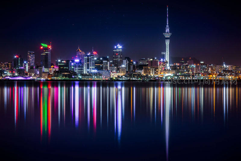 平静湖面如镜,清晰倒映着远处灯火通明的城市天际线与标志性高塔,五彩斑斓的光影在水中摇曳,营造出梦幻而宁静的都市夜景。