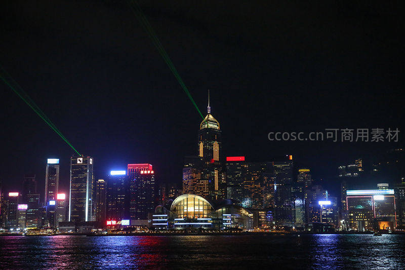 香港维多利亚港夜景迷人,摩天大楼灯光闪烁,绿色激光划破夜空,水面上倒影斑斓如梦似幻。
