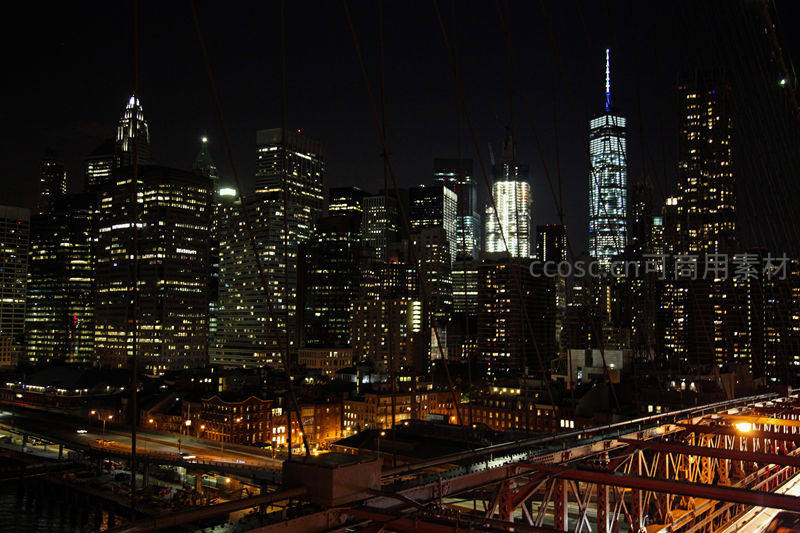 从布鲁克林大桥视角仰望曼哈顿夜景,自由塔高耸入云,城市灯火辉煌,桥索交错构成独特框架。