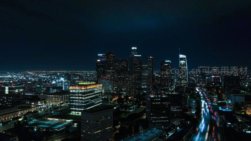 从高空俯瞰整座城市夜景,万家灯火与车流光带交织成网,摩天大楼群耸立如星河,尽显大都会的宏伟与活力。