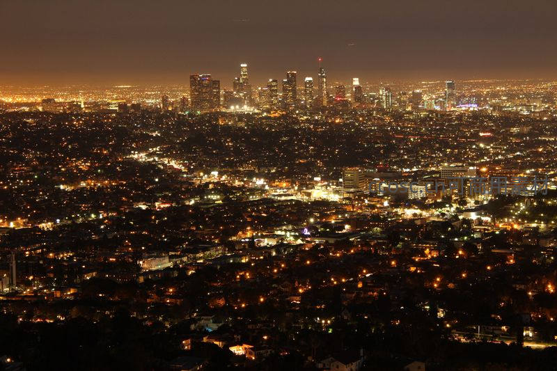 夜幕笼罩下的洛杉矶,从高处俯瞰,密集的住宅区与中心商务区灯火交相辉映,展现出这座国际大都市的温暖与活力。