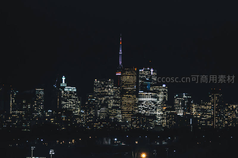 夜幕降临,多伦多市中心灯火辉煌,加拿大国家电视塔高耸入云,与周围摩天大楼共同构成壮丽的城市天际线,尽显都市活力与现代魅力。