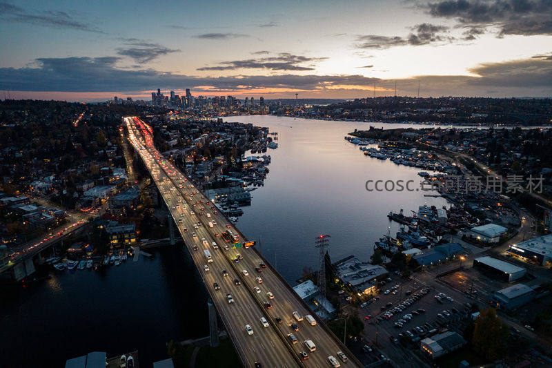 黄昏航拍下的跨海大桥与城市剪影