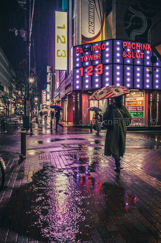 雨后湿漉漉的街道反射着五彩斑斓的霓虹灯光,一位行人撑伞缓步前行,营造出充满故事感和电影氛围的都市生活场景。