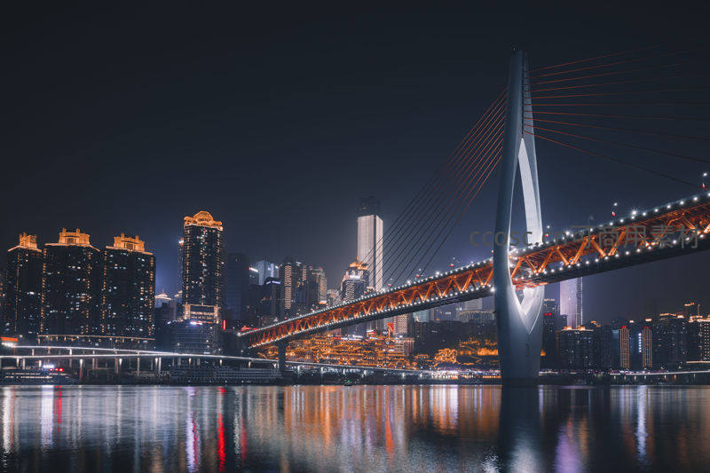 一座设计独特的斜拉桥在夜色中熠熠生辉,橙色的桥身与两岸依山而建、灯火通明的楼宇交相辉映,倒影在江水中,尽显山城魅力。