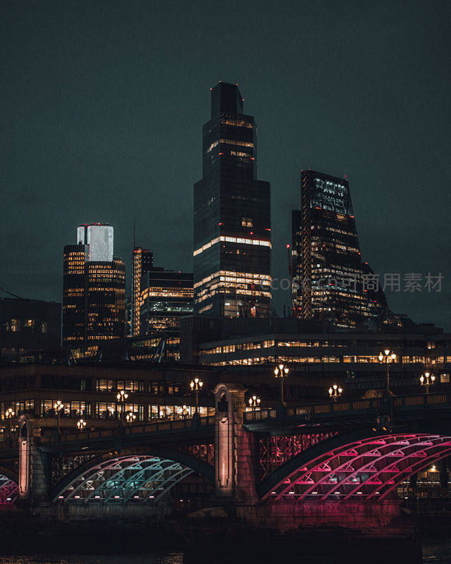 夜幕降临,摩天大楼灯火通明,色彩斑斓的霓虹桥横跨水面,倒影在波光中摇曳,展现出现代都市的繁华与浪漫。