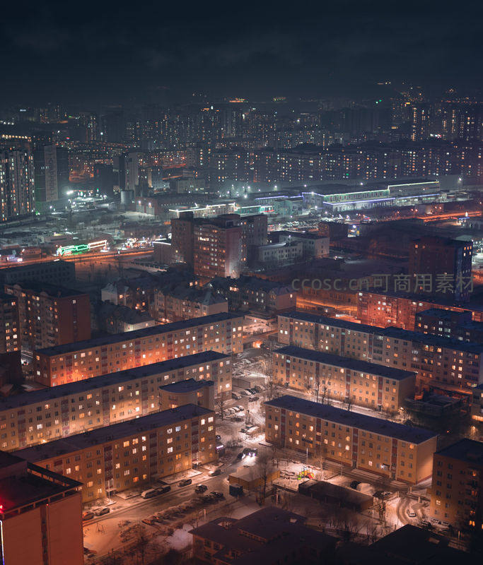 夜幕降临,雪花飘落,密集的居民楼窗户透出点点暖光,街道上车辆稀疏,营造出宁静而温馨的冬日城市生活氛围。