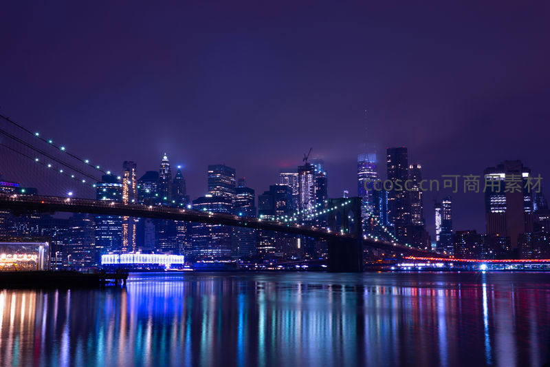 布鲁克林大桥夜景与曼哈顿天际线倒影