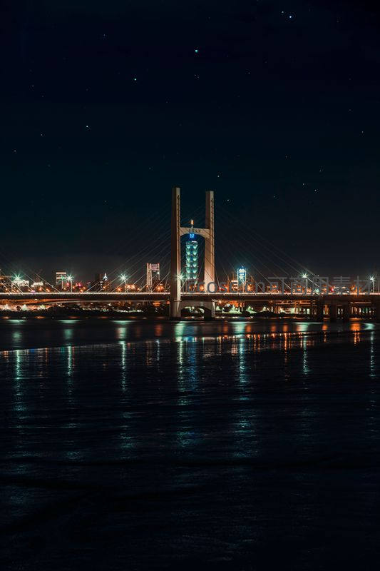 深邃夜空点缀着点点繁星,一座宏伟的斜拉桥横跨江面,桥身与两岸城市的璀璨灯火在波光粼粼的水面上交相辉映,营造出梦幻般的宁静氛围。