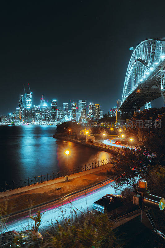 宏伟的拱桥在夜色中熠熠生辉,与对岸灯火辉煌的摩天楼群相映成趣,构成壮丽的滨海都市夜景。