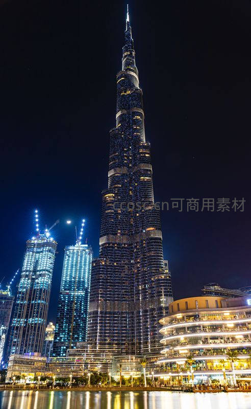 夜晚的迪拜哈利法塔在璀璨灯光的映衬下直插云霄,周边高楼与水面倒影交相辉映,展现现代都市的壮丽与繁华。