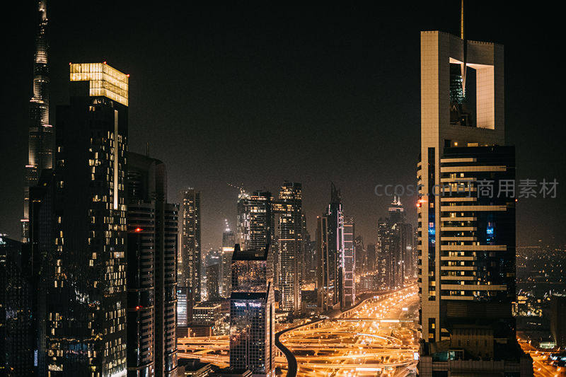 迪拜繁华都市的璀璨夜景,高楼林立,灯火辉煌,车流如织形成光轨,展现现代都市的活力与科技感。