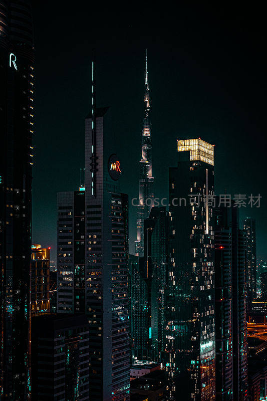 哈利法塔在深邃夜空中巍然耸立,周围高楼环绕,霓虹闪烁,构成一幅充满未来感的现代都市天际线画卷。
