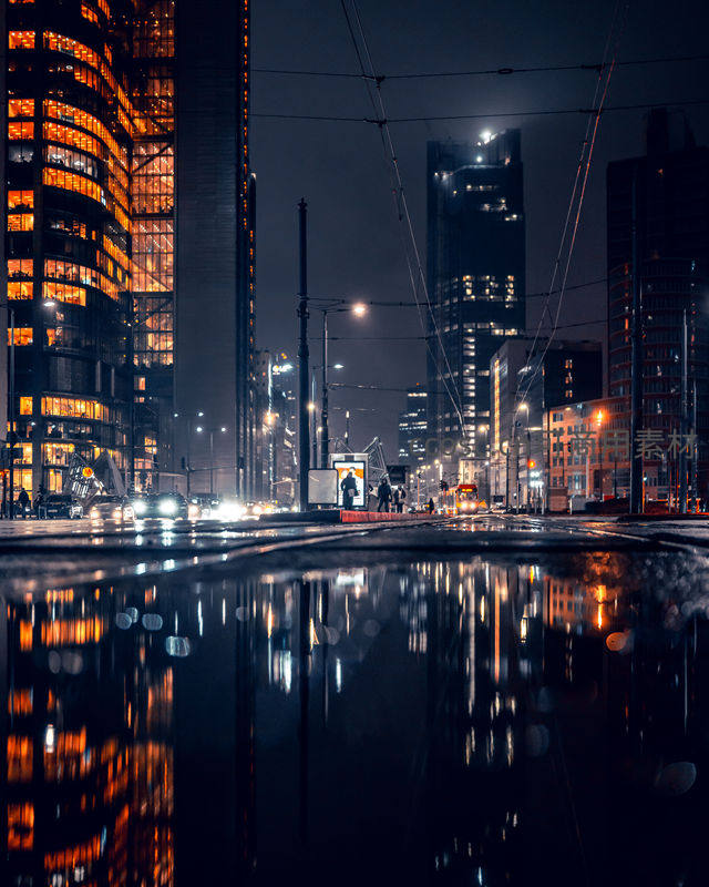雨后街巷灯火,玻璃幕墙映照流光溢彩
