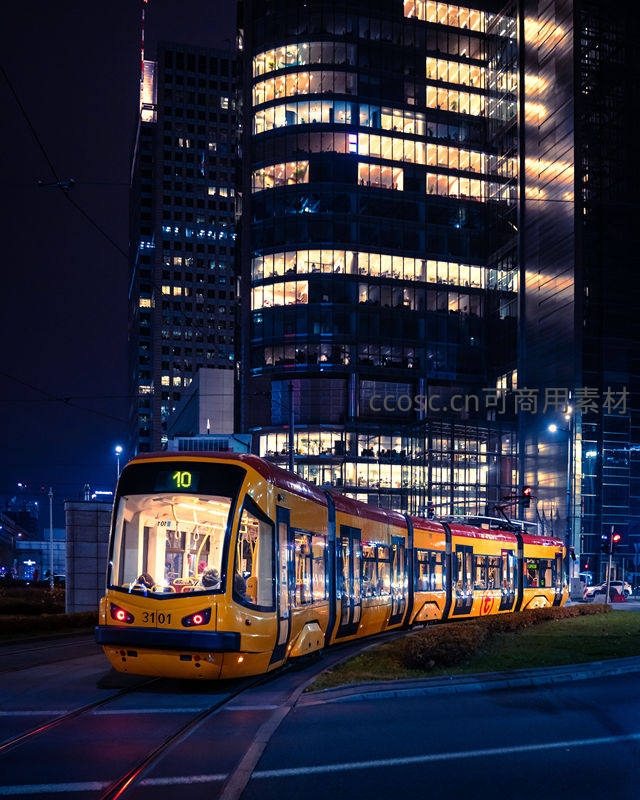 一辆明亮的黄色电车行驶在轨道上,背景是灯火辉煌的玻璃幕墙大厦,展现了现代城市中公共交通与建筑的和谐共存。