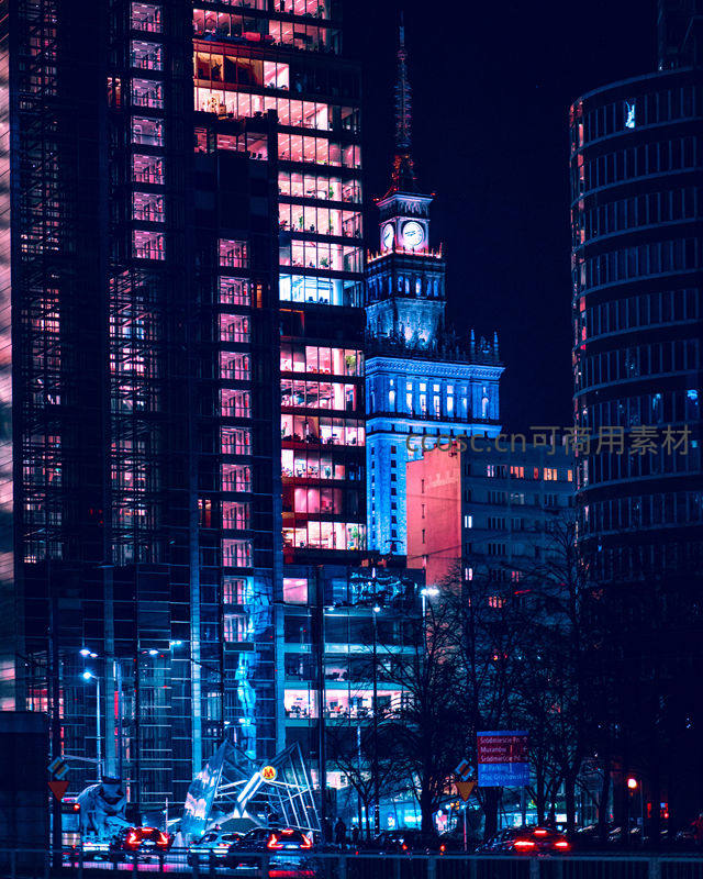 霓虹都市中的钟楼剪影