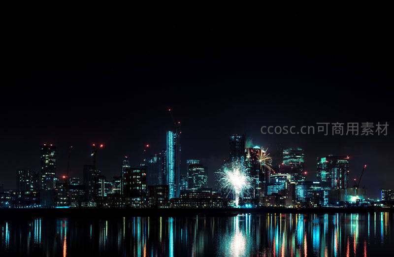 河畔烟花绽放照亮城市天际线