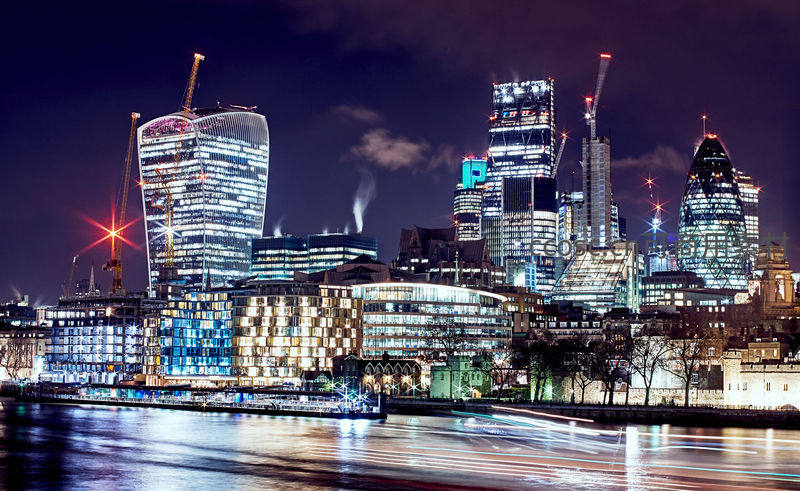 伦敦金融城的标志性摩天大楼群在夜晚灯火通明,泰晤士河上船只划过留下流动的光轨,构成一幅充满动感与现代感的都市画卷。