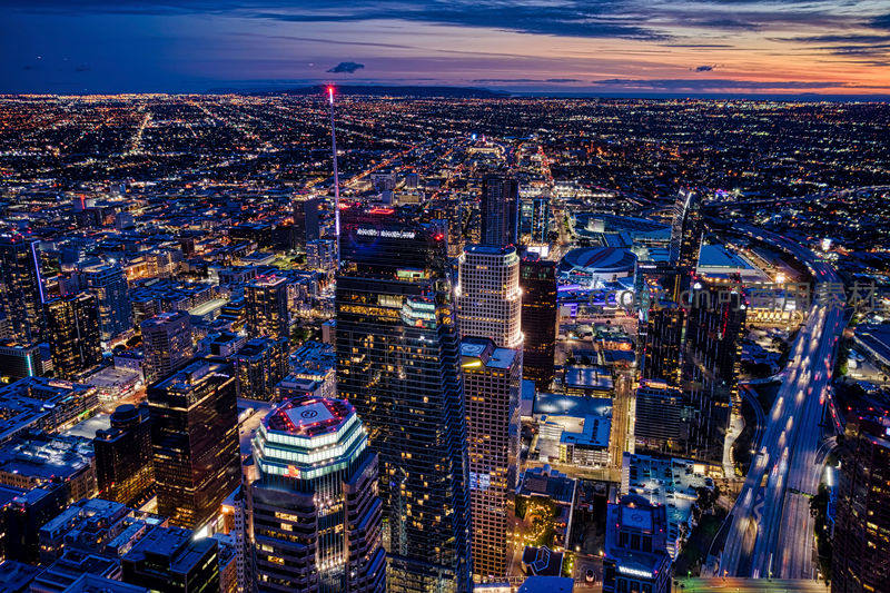 从高空捕捉墨尔本日落时分的城市景象,天空霞光未褪,城市灯光已渐次亮起,车流在高速公路上划出光轨,动静结合。