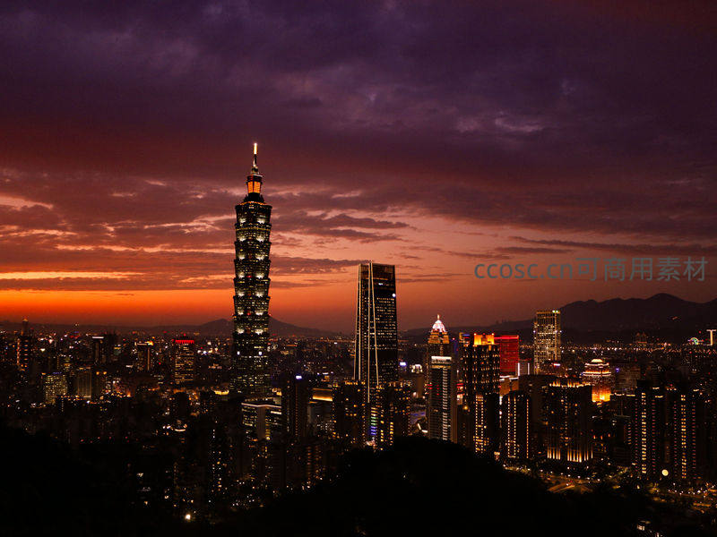 在绚丽的晚霞映衬下,高耸入云的摩天大楼轮廓分明,城市与自然交融,构成一幅壮丽的城市画卷。