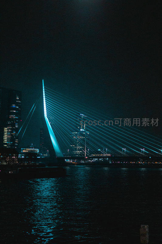 一座被蓝色灯光点亮的斜拉桥静卧于河面之上,倒影随波荡漾,营造出宁静而梦幻的都市夜景氛围。