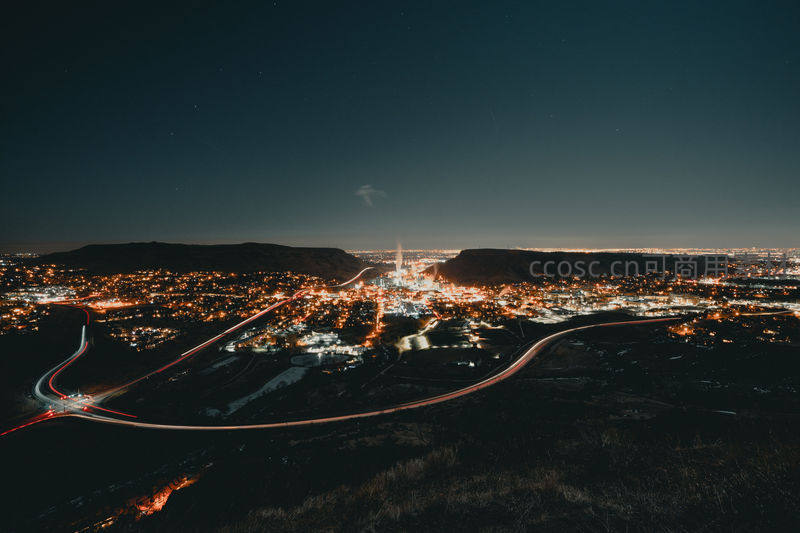 从高处俯瞰,城市在夜幕下被万家灯火点亮,蜿蜒的公路如丝带般穿梭于山丘之间,车灯轨迹勾勒出流动的生命力。