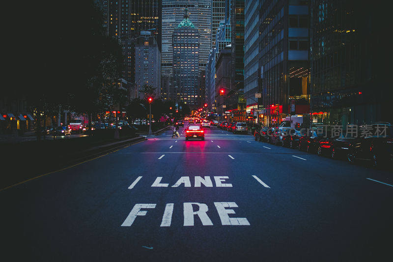 深邃的街道上,醒目的“FIRE LANE”字样映衬着前方车辆的红色尾灯,两侧高耸的楼宇与闪烁的霓虹共同构筑了都市夜晚的独特风景。