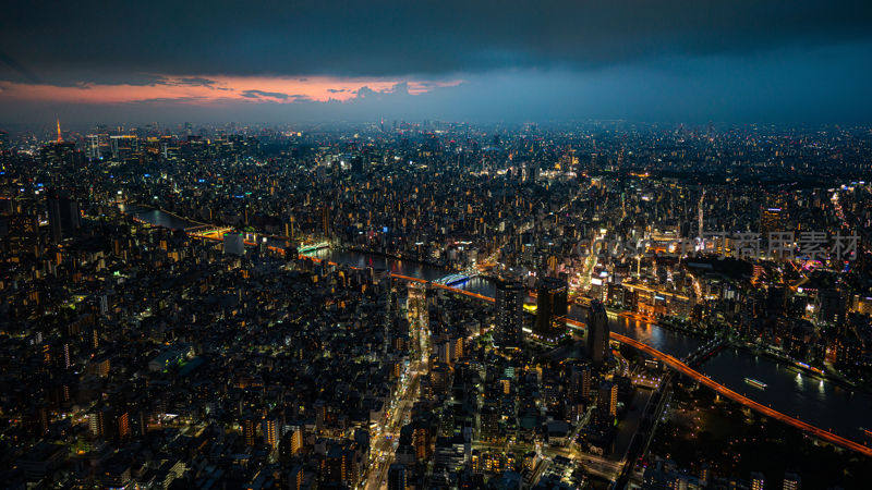 黄昏将尽,城市华灯初上,万家灯火连成一片光海,蜿蜒河流与桥梁穿城而过,云层低垂,营造出既壮阔又宁静的都市暮色氛围。