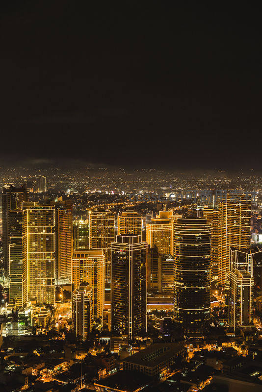 高角度俯瞰城市夜景,摩天大楼林立,万家灯火点亮夜空,展现现代都市的繁华与活力。