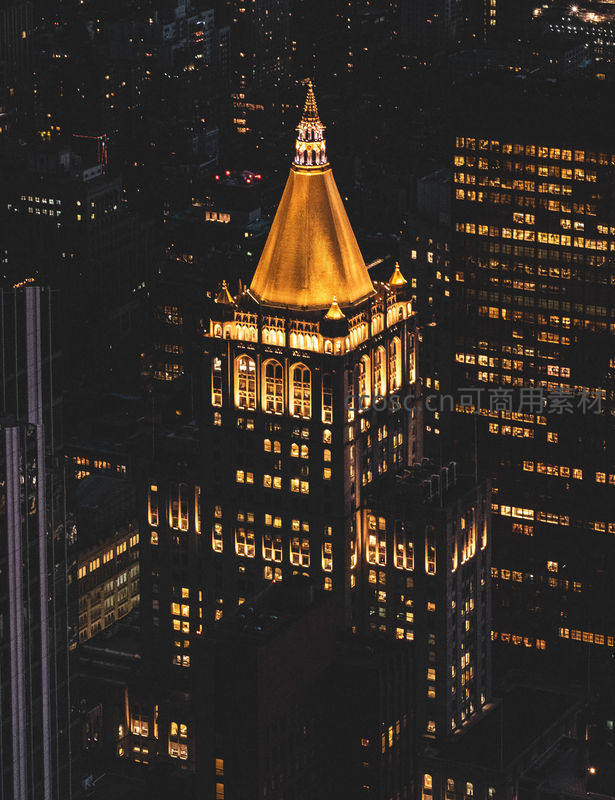 夜幕下的金色尖顶摩天楼