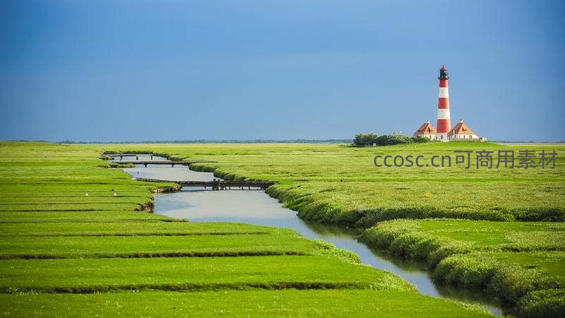 广阔的绿色湿地中蜿蜒着清澈的小河,远处矗立着一座醒目的红白条纹灯塔,在晴朗的蓝天下显得格外宁静和谐,是自然与人文的完美结合。