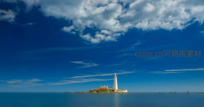 一座洁白的灯塔孤独地伫立在小岛上,四周被平静的海水环绕,头顶是广阔无垠的蓝天和飘动的白云,构成一幅令人心旷神怡的海上风景画。