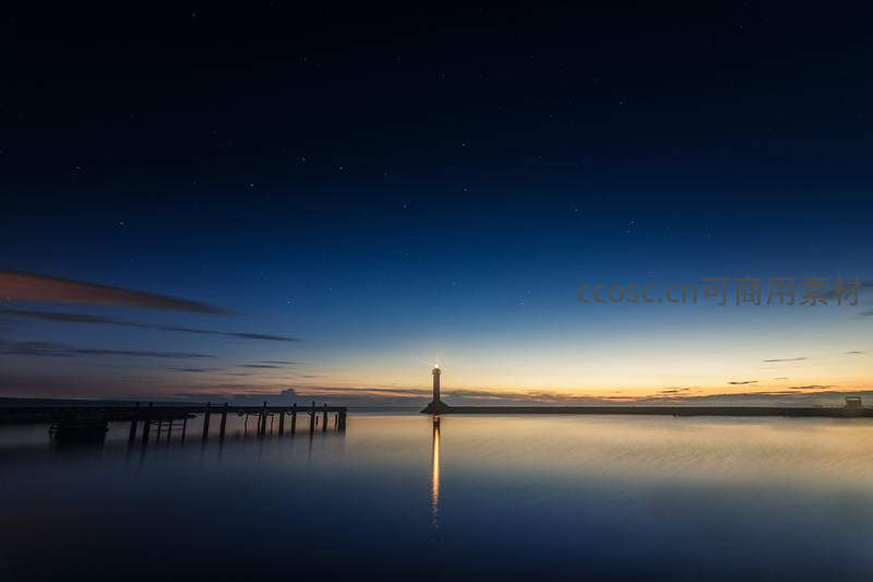 深蓝色的夜空繁星点点,远方的灯塔发出柔和的光,在如镜面般平静的水面上投下清晰的倒影。左侧延伸的木质码头剪影,增添了画面的纵深与静谧。