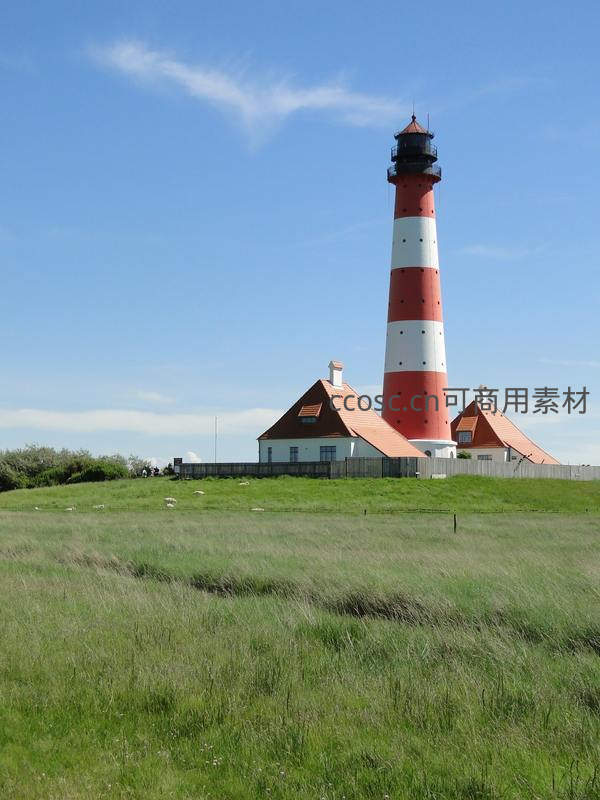 在广袤的绿色草地上,一座经典的红白条纹灯塔静静伫立,几只绵羊悠闲吃草,远处蓝天白云飘逸,展现田园牧歌般的宁静与和谐。