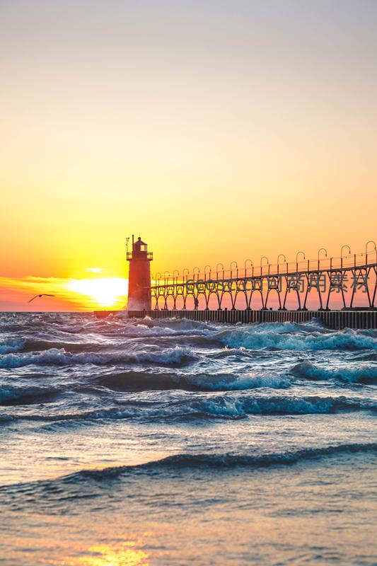 金色夕阳沉入海平线,波涛汹涌拍打着延伸至海中的防波堤,尽头的灯塔化作剪影,一只飞鸟掠过,构成壮丽而诗意的海滨黄昏景象。