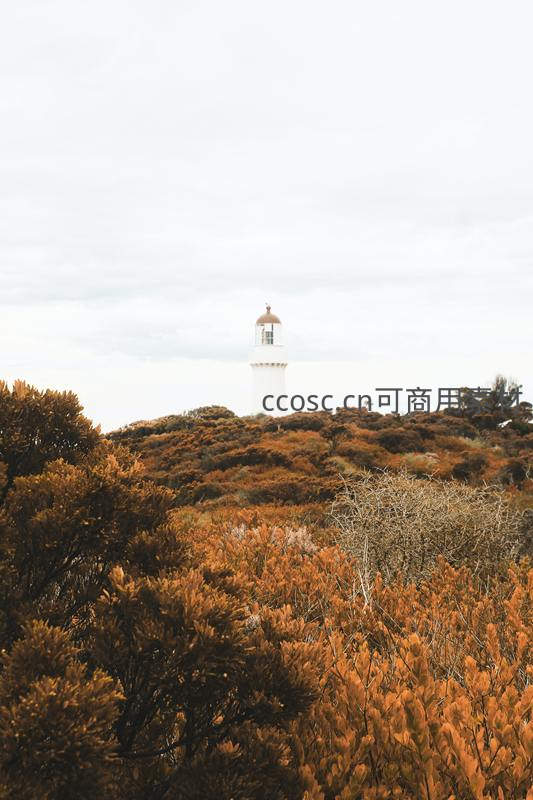 秋日海岸灯塔静立灌木丛中