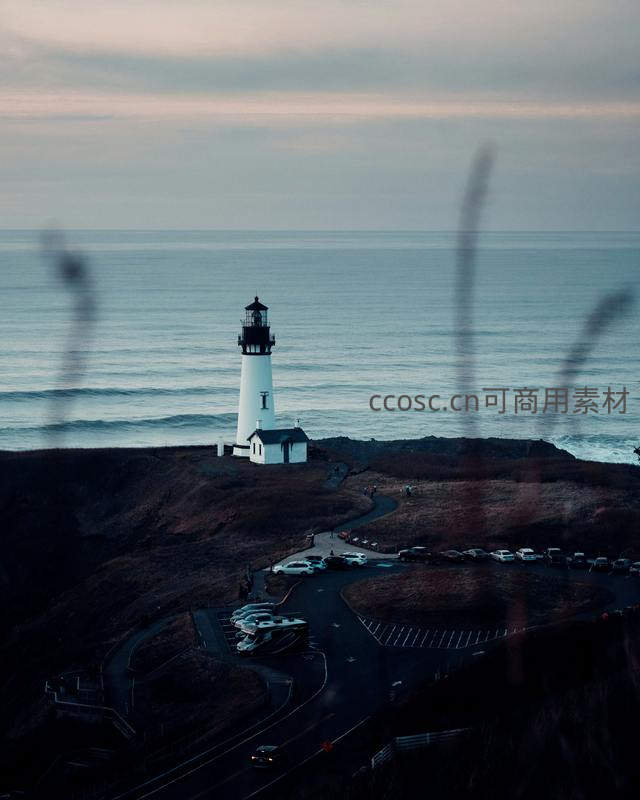 从高处俯瞰,灯塔屹立于海角悬崖,下方蜿蜒道路与停满车辆的停车场清晰可见,暮色为海天染上温柔色调。