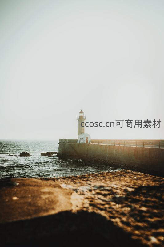 一座小巧的灯塔坐落在延伸入海的混凝土码头尽头,金色晨光洒在波涛上,近处礁石清晰可见,营造出温暖平和的海滨清晨氛围。