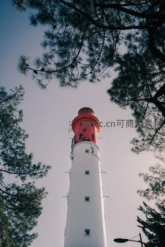 从低角度仰视一座白身红顶的高大灯塔,四周松树枝叶交错,形成天然画框,突显建筑的宏伟与自然的和谐。