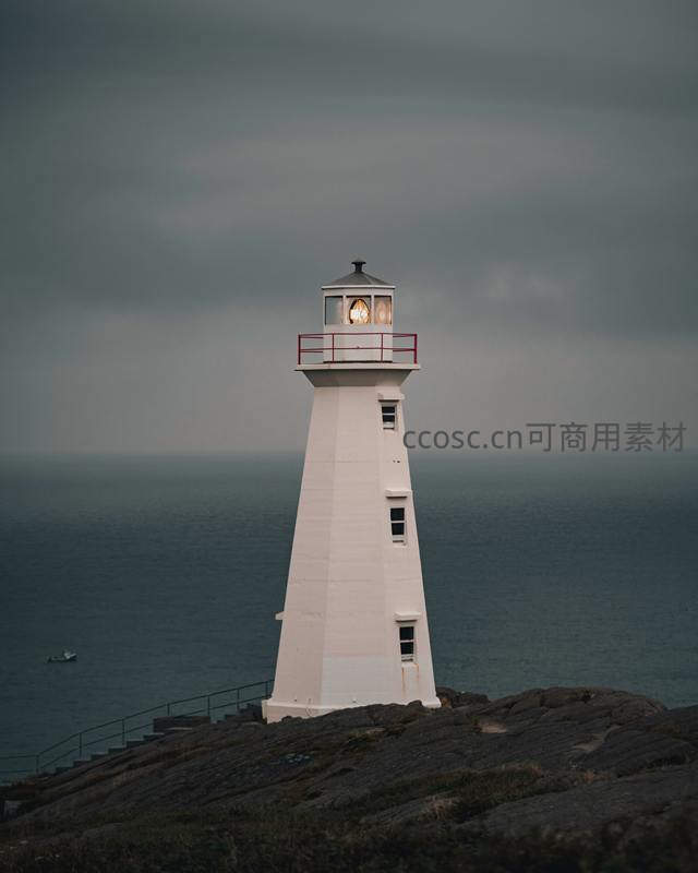 一座白色灯塔矗立在崎岖海岸,昏黄灯光穿透阴沉天空,为归航船只指引方向,展现自然与人文的静谧对话。