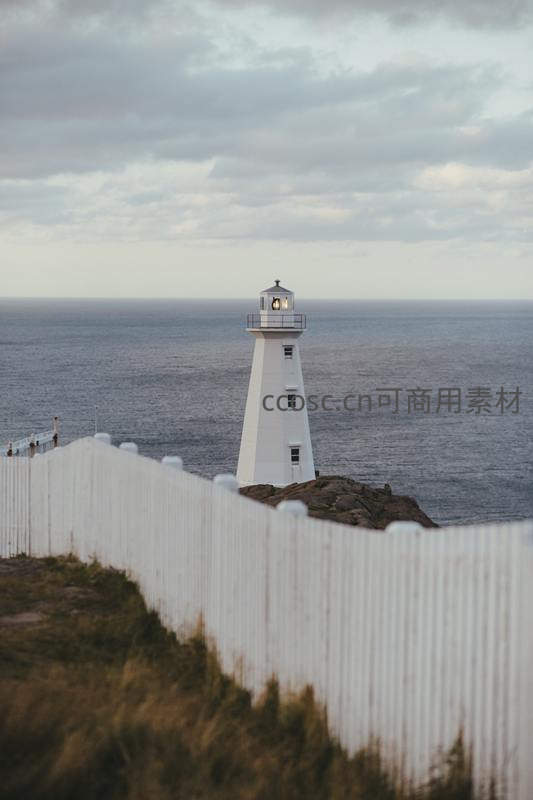 前景白色木栅栏引导视线,聚焦远处屹立海崖的灯塔,灰白云层下波涛起伏,营造出宁静而富有故事感的滨海氛围。