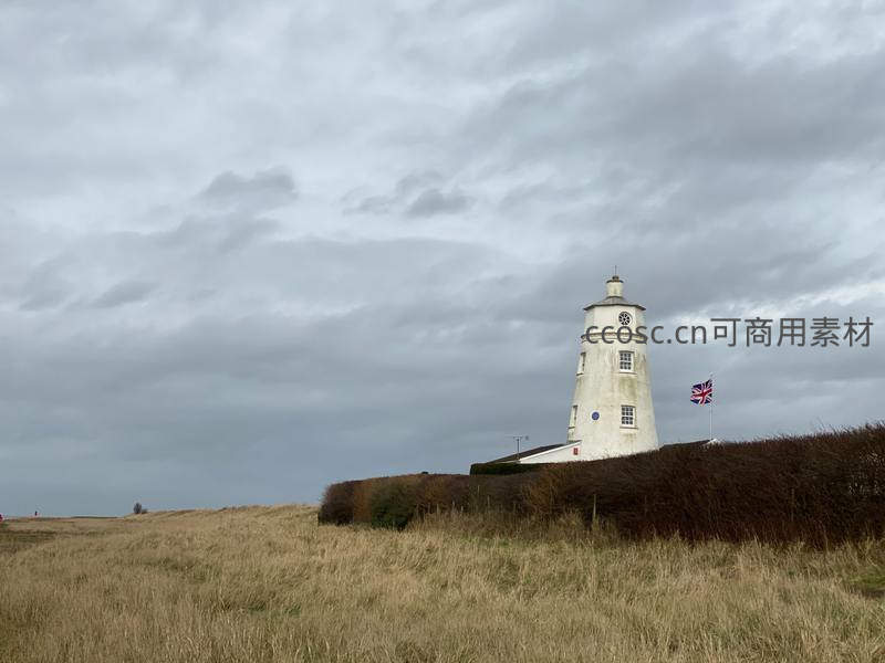 一座古典风格的白色灯塔坐落在金黄草甸边缘,屋顶飘扬着米字旗,在厚重云层下透出历史感与英伦风情。