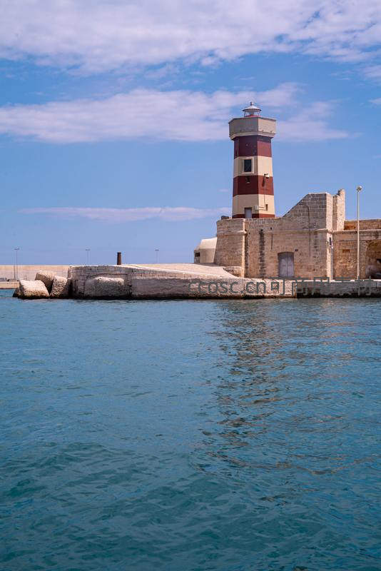 红白条纹灯塔屹立于石质码头尽头,碧蓝海水轻拍堤岸,阳光洒落,倒影粼粼,为进出港船只提供安全指引。