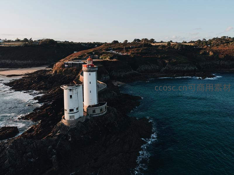 从高空俯瞰,一座洁白的灯塔矗立在崎岖的黑色礁石之上,与蔚蓝大海和金色沙滩构成壮丽画卷,是航海者的安全坐标。