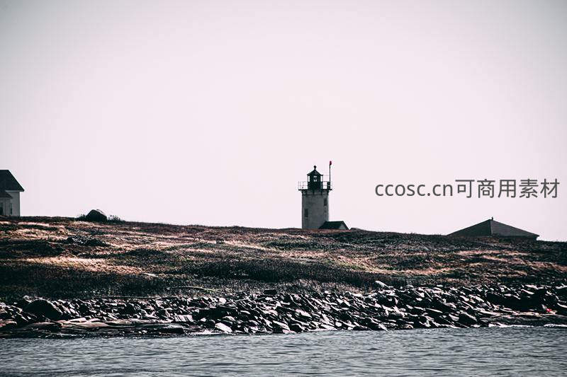 在灰白天空下,一座小巧的灯塔静静伫立于荒芜的岛屿之巅,前方是平静的海水和嶙峋的礁石,传递着远离尘嚣的孤寂与安宁。